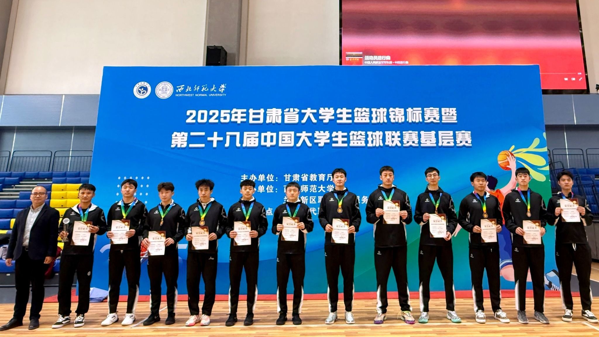10月25日至31日,2025年甘肃省大学生篮球锦标赛在兰州举行,来自全省38所高校的660余名运动员参与角逐。我校组织男子甲组、乙组篮球队参赛,其中男子乙组篮球队在激烈的竞争中脱颖而出,最终斩获季军,同时荣获赛事优秀组织奖。