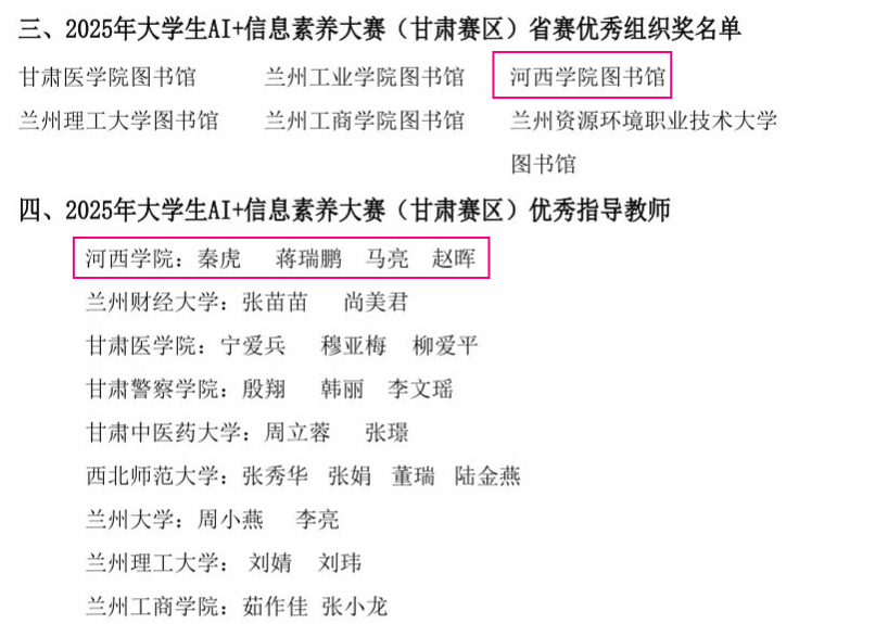 本次大赛的优异成绩,不仅反映了学校在跨学科融合育人方面的扎实成效,也体现了河西学子优秀的信息素养与AI实践能力,下一步,学校将持续推进信息素养与创新训练的深度融合,以赛促教,以赛促学,不断提升河西学子的核心竞争力,为学校高素质创新人才培养注入持久动力。