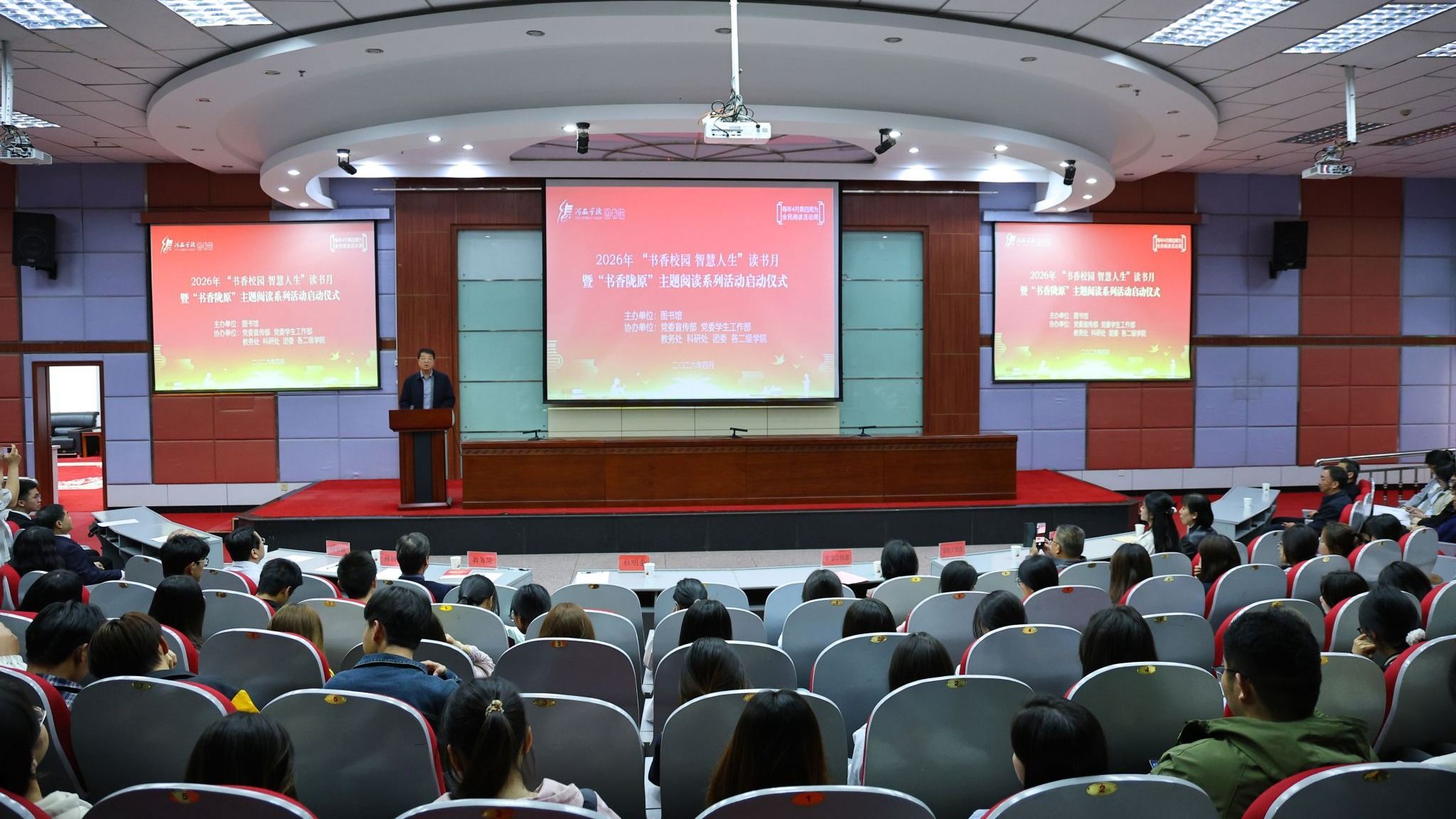 4月23日,在第31个“世界读书日”来临之际,河西学院2026年“书香校园 智慧人生”读书月暨“书香陇原”主题阅读系列活动启动仪式在图书馆学术报告厅举行。党委常委、副校长杜明奎出席并宣布活动开幕。
