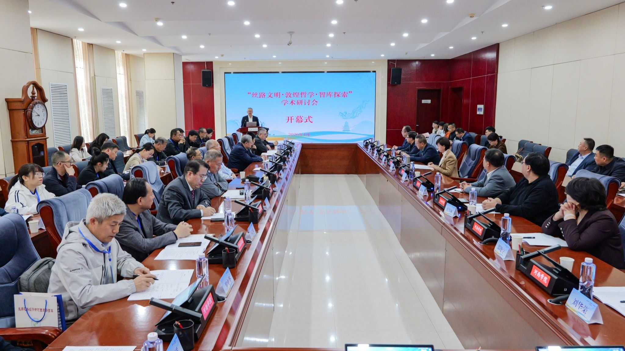 4月26日,“丝路文明。敦煌哲学。智库探索”学术研讨会在河西学院召开。复旦大学,兰州大学,中央民族大学,内蒙古师范大学,西安外国语大学,西北师范大学,西北民族大学,兰州交通大学,甘肃警察学院,甘肃民族师范学院等20余所省内外高校专家学者齐聚,围绕丝路文明传承,敦煌哲学阐释,智库创新发展三大议题,展开学术对话与跨领域交流,为河西区域文化繁荣与高质量发展凝聚智慧共识。