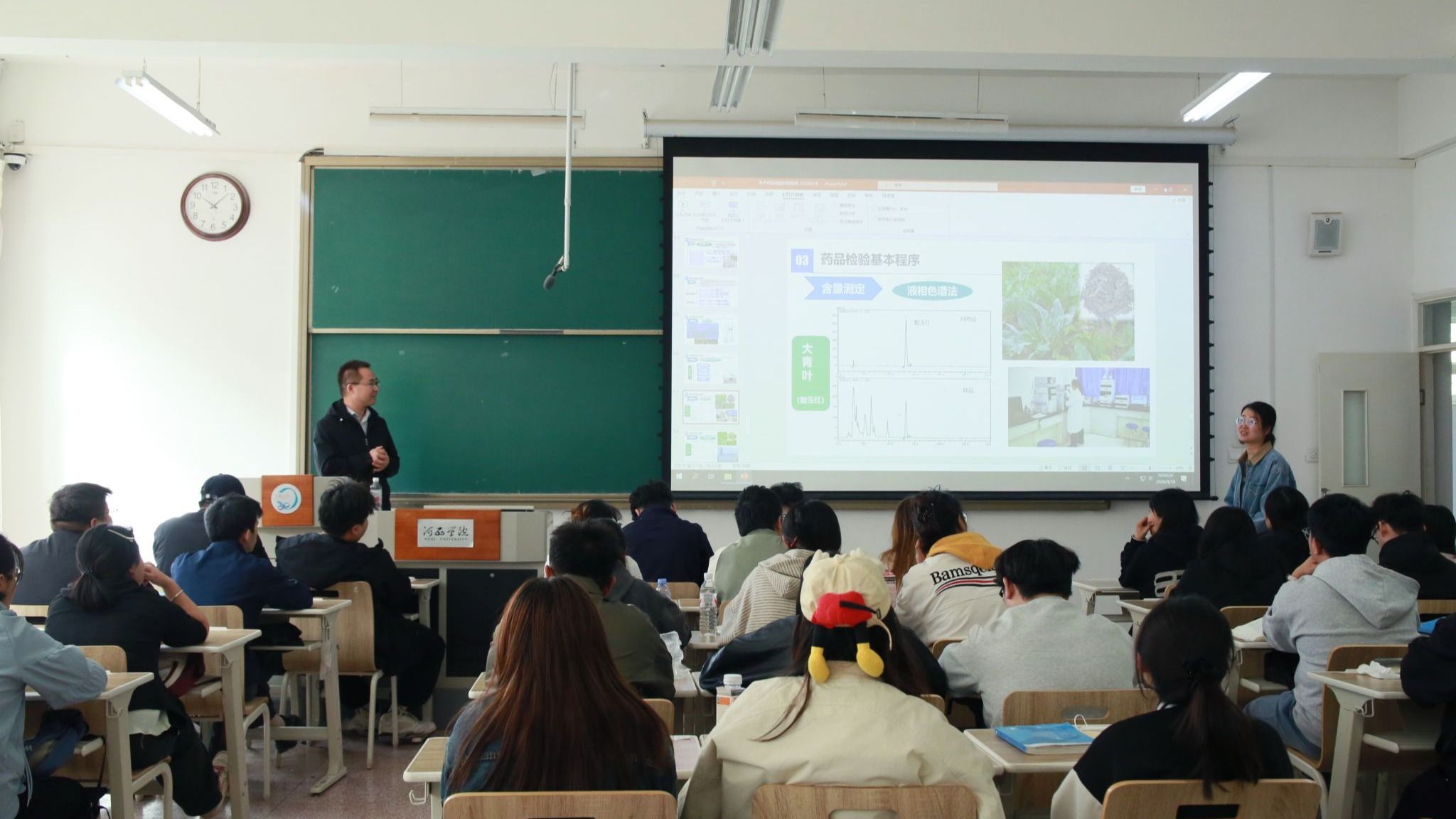 授课过程中,杨玺文从药品及其分类、药品质量标准、药品检验基本程序三个方面,讲解药品分析检验的相关标准与实操流程,并结合具体工作案例讲解专业知识在实际生产中的应用,授课内容兼具理论深度与实践指导价值,既贴合专业知识体系要求,又紧密衔接行业实际应用,获得在场师生的一致好评。