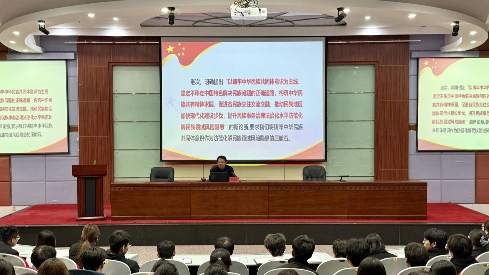 三位宣讲人分别以《铸牢中华民族共同体意识的逻辑维度和哲学向度》《以抗战精神砥砺青春担当——新时代学生干部的使命传承与责任担当》《习近平总书记关于青年和青年工作重要论述的科学内涵和实践要求》为题,系统解读了马克思的交往理论与共同体思想、中国共产党的民族平等团结思想、伟大抗战精神的深刻内涵与时代回响、习近平总书记关于青年和青年工作重要论述的科学内涵和实践要求、青年工作的方向方法等内容,教育引导同学们要准确把握中华民族关系的历史脉络和现实状况,将伟大抗战精神转化为服务同学、建设校园的具体行动,履行好新时代青年和“青马”骨干的职责,做马克思主义的坚定信仰者、积极传播者和模范践行者。