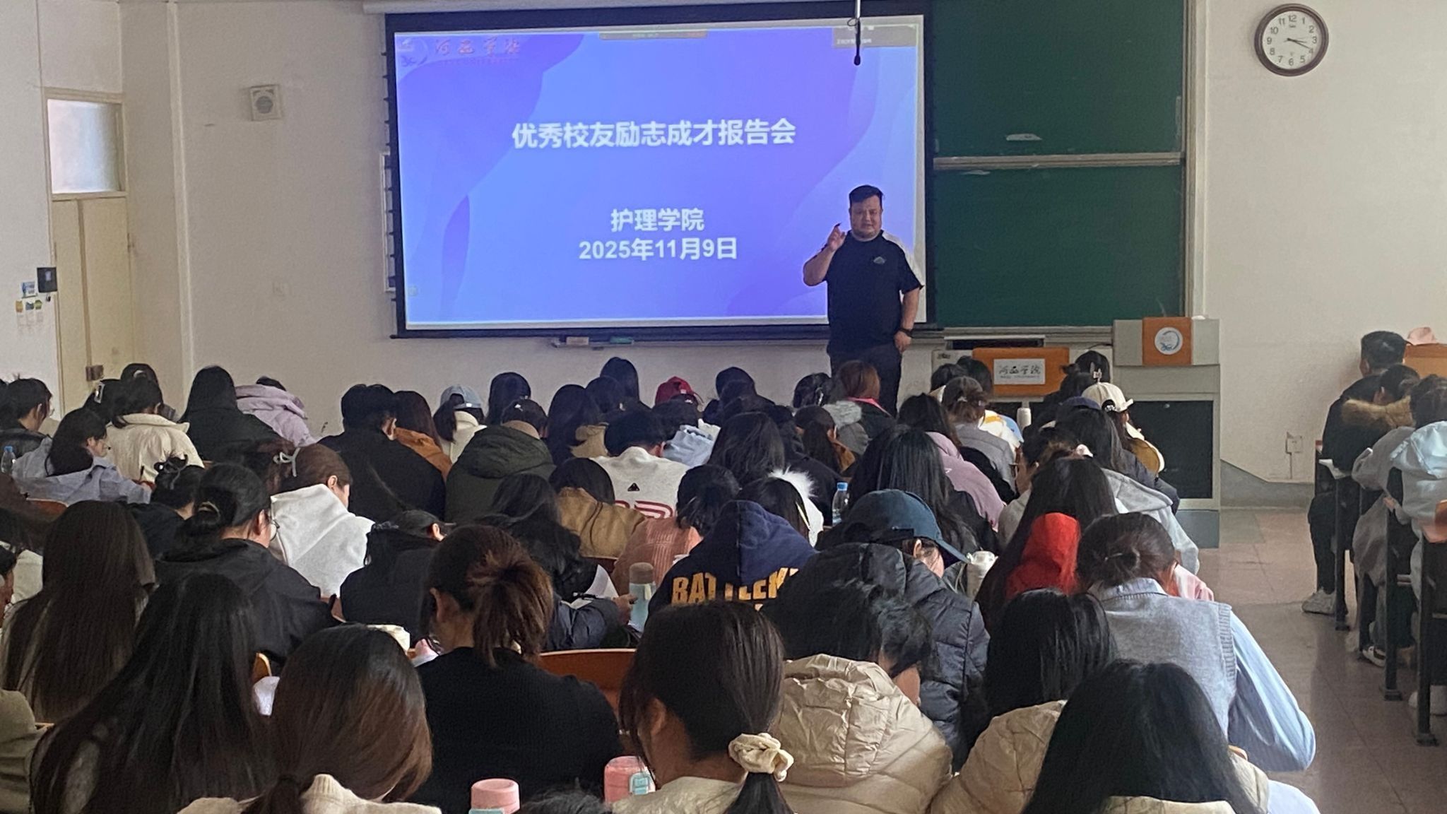 11月8日至9日,护理学院举办优秀校友励志成才报告会,校友会第三届理事会副会长、2007届校友豆宝珍,兰大医院手术室护师、2015届校友郑军应邀作报告,报告会由学院党委负责人主持,辅导员及大三年级学生参加。