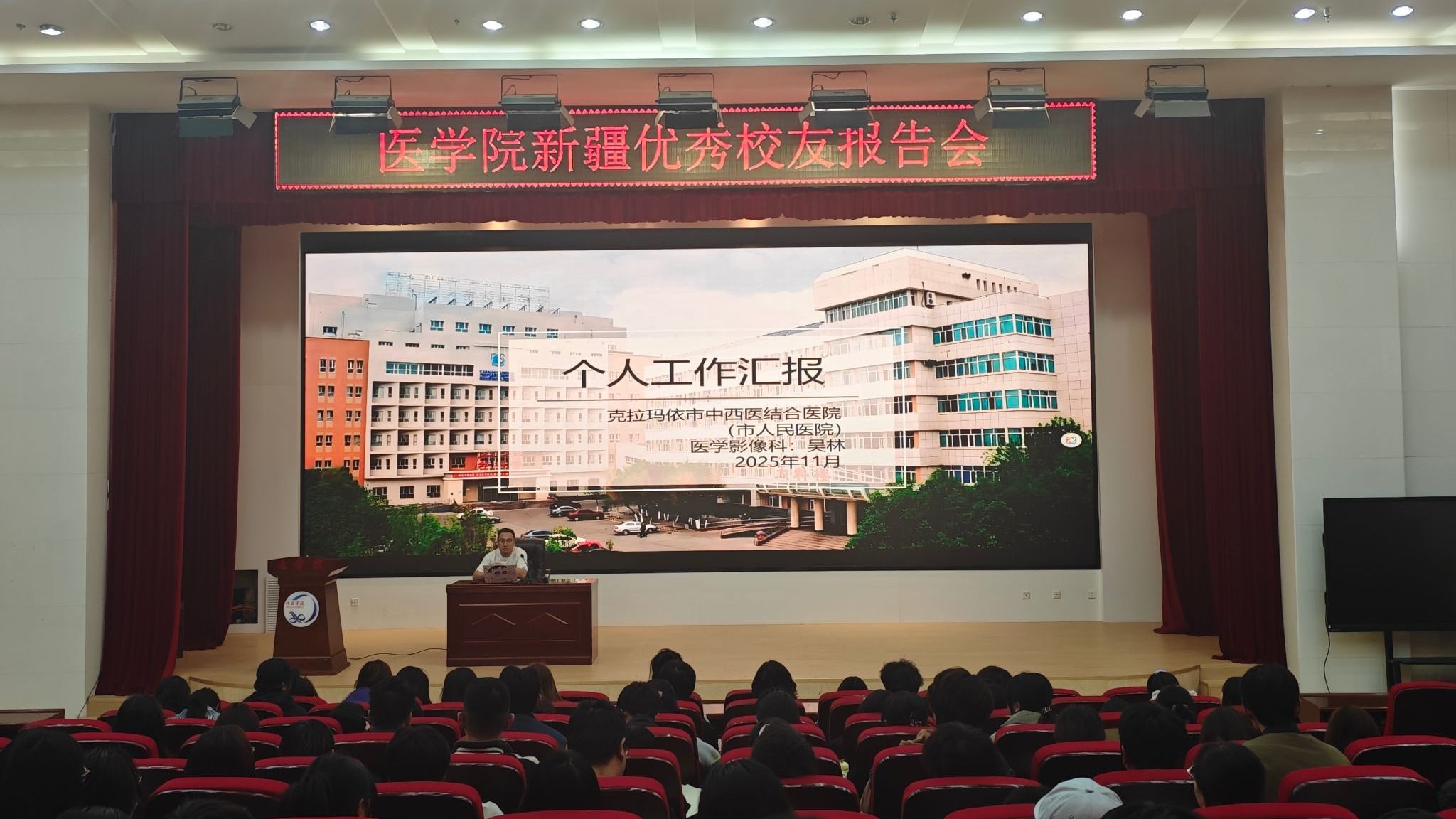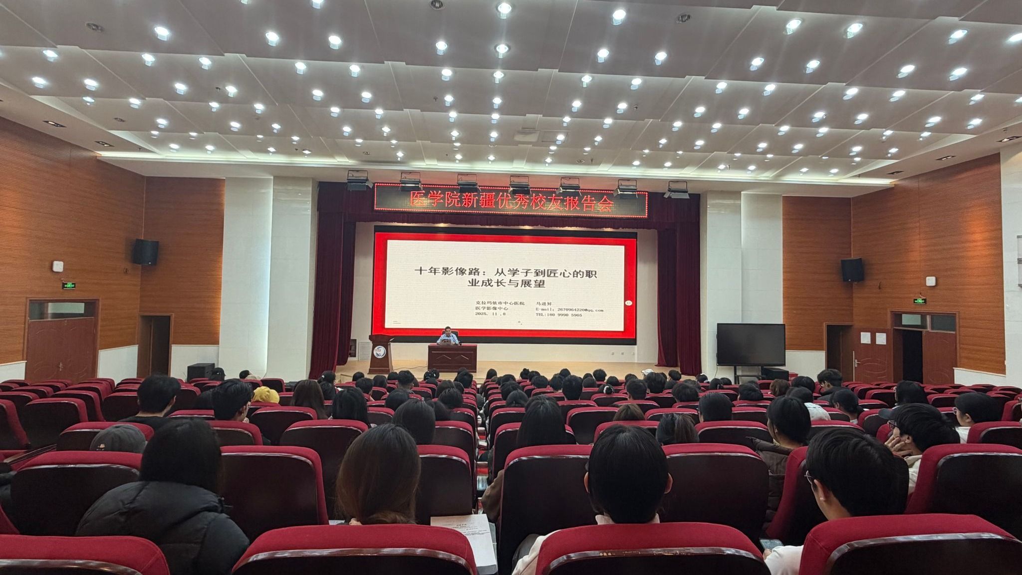 11月10日,医学院邀请新疆优秀校友克拉玛依市中心医院马进昇、克拉玛依市中西医结合医院吴林来院进行经验分享交流,学院200余名学生参加。