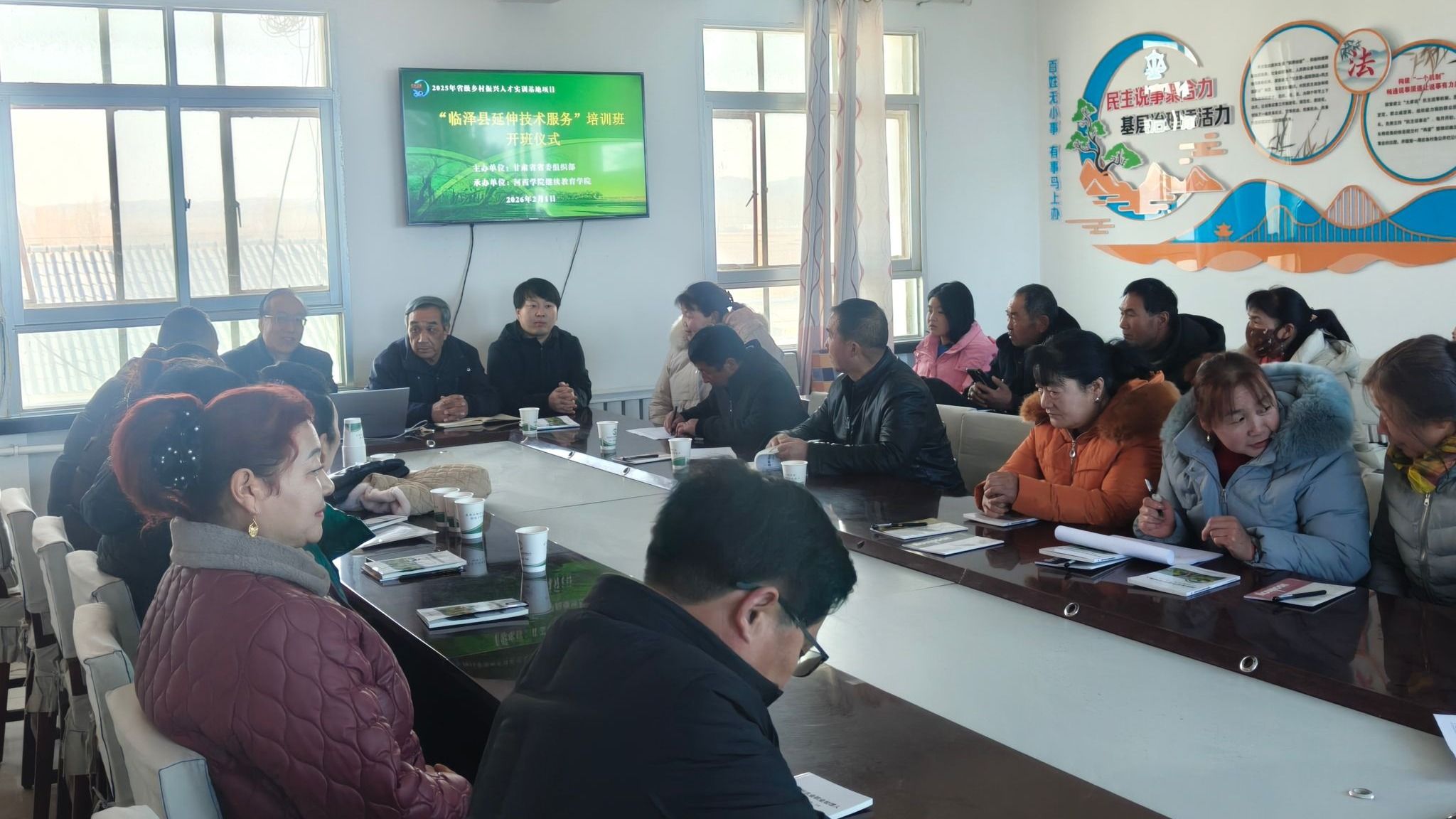 2月1日,开班仪式在临泽县平川镇三二村村委会举行,学校授课教师代表、村委会负责人及三二村学员参加。本次培训打破集中授课局限,分别在临泽县平川镇三二村和板桥镇板桥村、红沟村、壕洼村设置教学点,最大化方便学员就近参训。