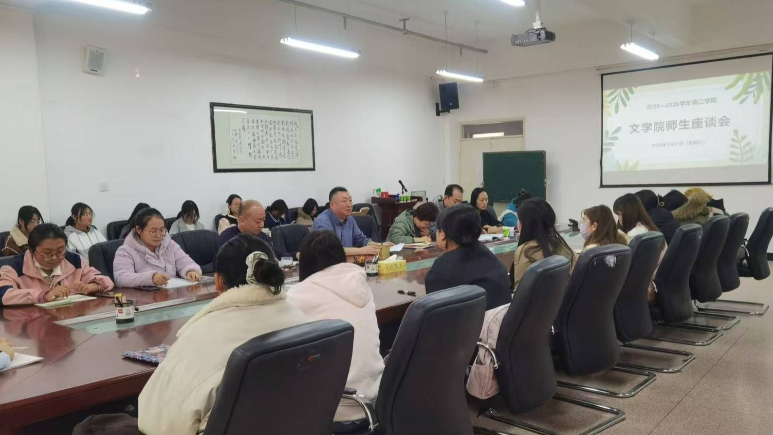 3月21日,文学院召开2026年春季学期师生座谈会。座谈会以“倾听师生心声,共话学院发展”为主题,分两组同步进行,全院在校14个班级的70余名学生代表与学院领导班子成员、教学督导委员等齐聚一堂,展开深入交流。