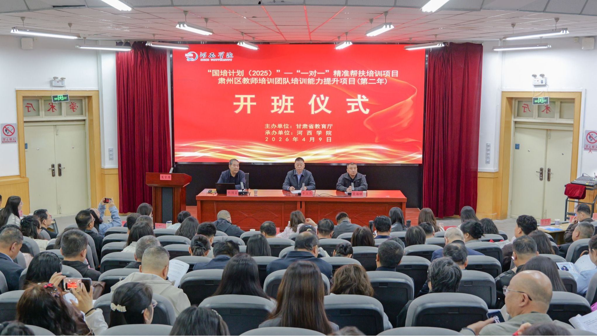 4月9日,由学校承担的“国培计划(2025)” “一对一”精准帮扶培训项目肃州区教师培训团队培训能力提升项目(第二年)培训班开班仪式在一号学术厅举行。继续教育学院、肃州区教育事业发展服务中心负责人、学科指导负责人、班主任和培训学员共110人参加。