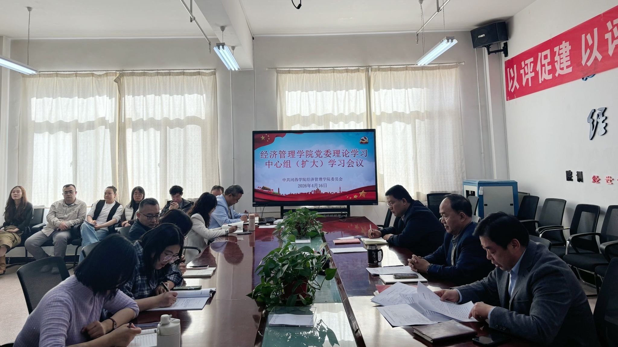 4月16日,经济管理学院召开党委理论学习中心组(扩大)学习会,学院党委理论学习中心组成员,学院教职工与学生支部委员参加。