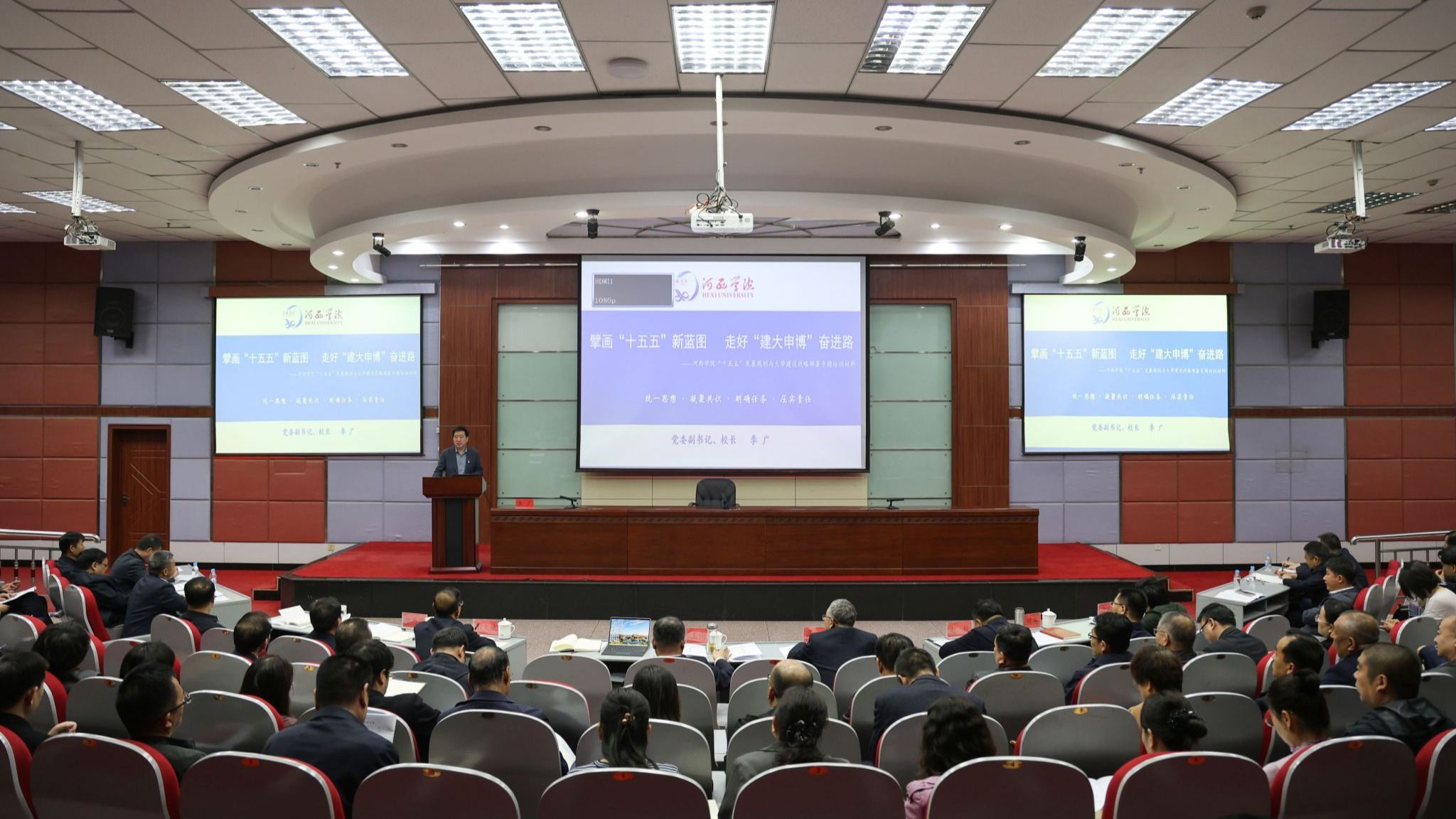 4月1日,党委副书记、校长李广为学校学习贯彻党的二十届四中全会精神暨高质量发展集中培训班作了题为《擘画“十五五”新蓝图 走好“建大申博”奋进路》的首场专题辅导报告。党委副书记高荣主持报告会,全体学校领导、党委常委及培训班全体成员共计200余人聆听。