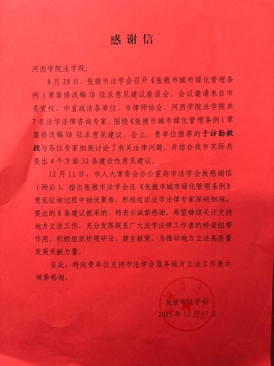 近日,张掖市法学会向法学院发来的感谢信,对法学院及于访勤副教授在《张掖市城市绿化管理条例(草案修改稿)》立法意见征集工作中的贡献表示感谢。