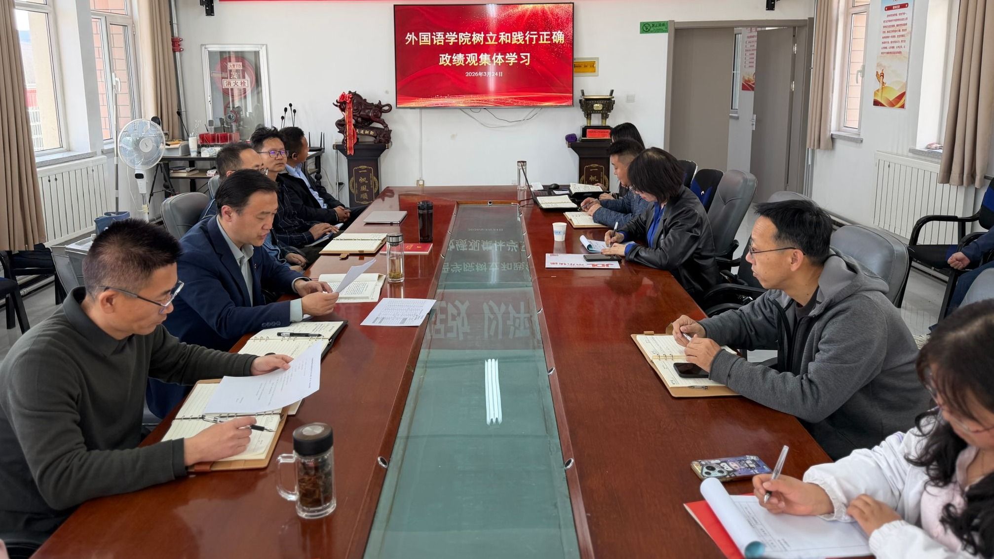 3月24日,外国语学院召开党委理论学习中心组(扩大)学习会,开展树立和践行正确政绩观专题学习。学院党委理论学习中心组成员、全体党员、教师代表参加。